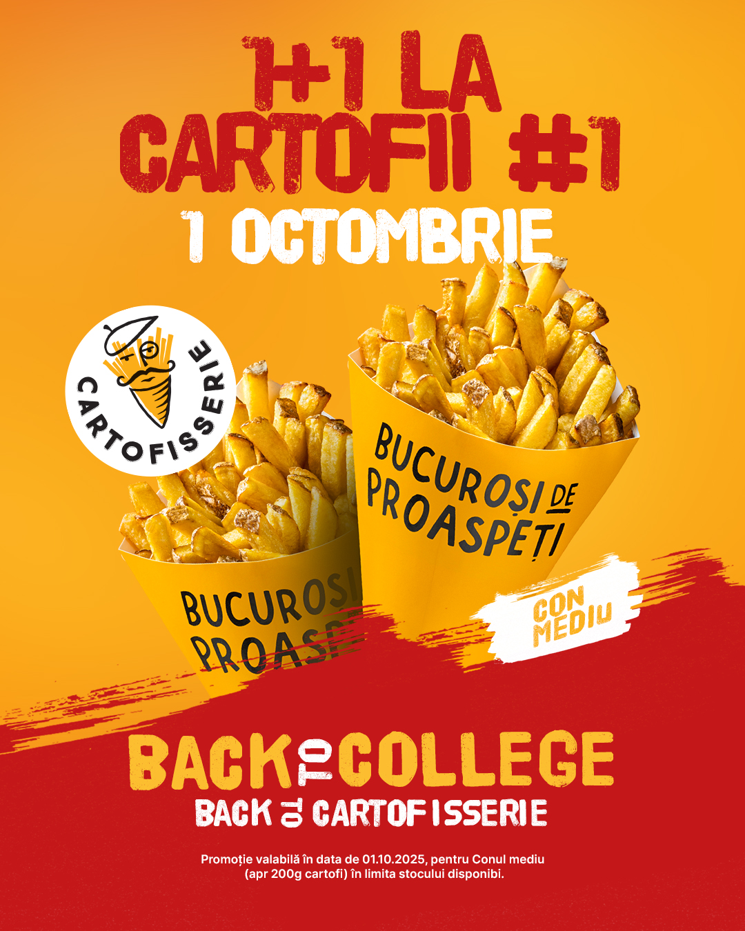 Oferta este valabilă doar pe 1 octombrie, în limita stocului disponibil. Hai să începem anul universitar cu vibe bun și cartofi crocanți!