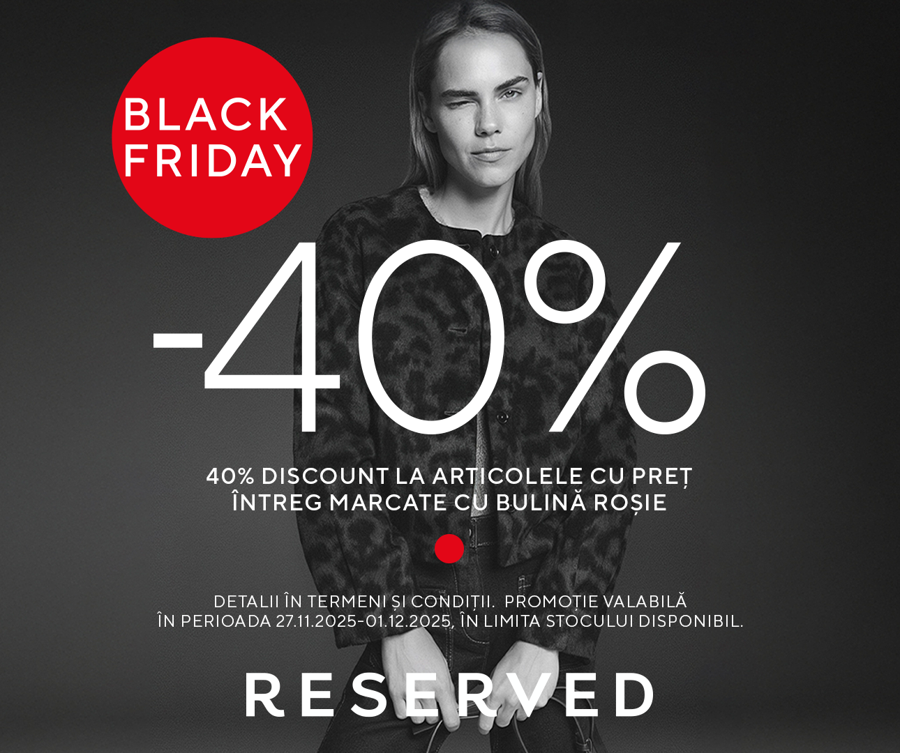 Între 27 noiembrie și 1 decembrie, bucură-te de -40% la piesele cu preț întreg marcate cu bulină roșie, pentru cumpărături de minimum 75 RON.