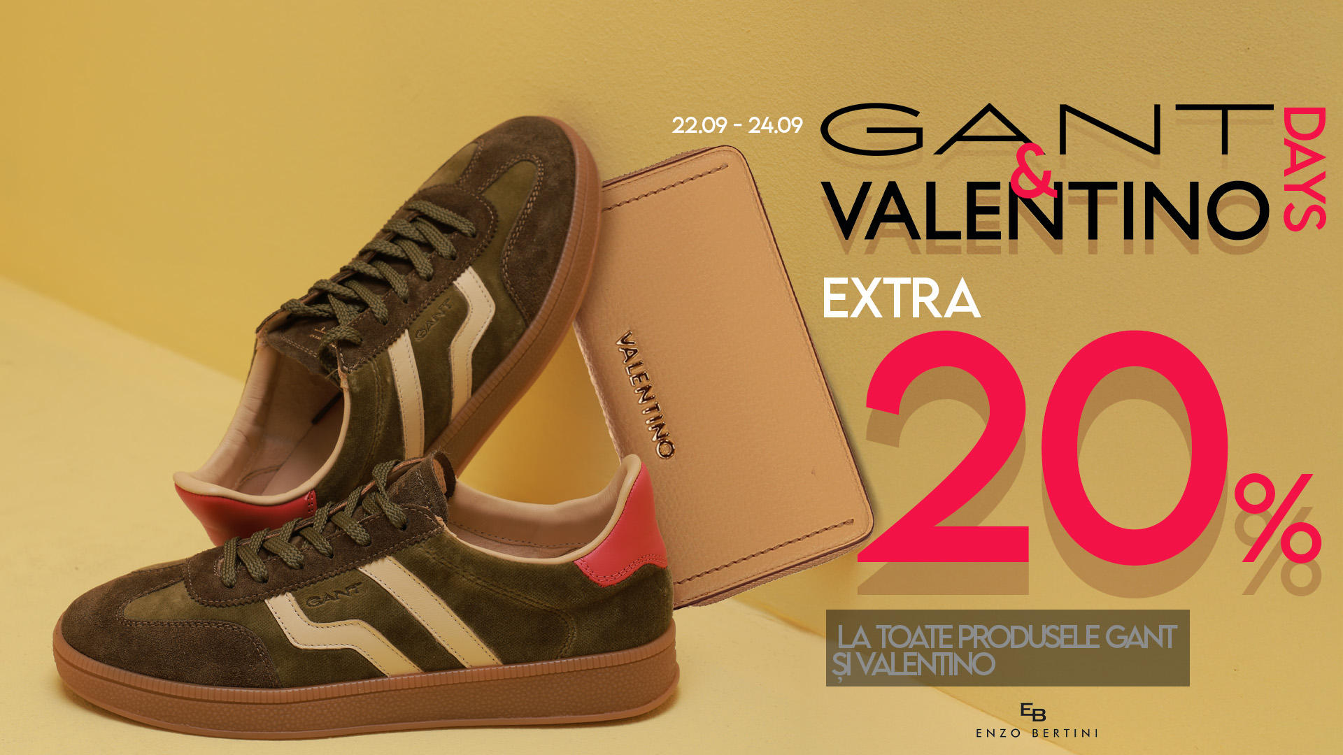 Pe 22, 23 și 24 septembrie, ai parte de 20% reducere la toate produsele din colecțiile Gant și Valentino.