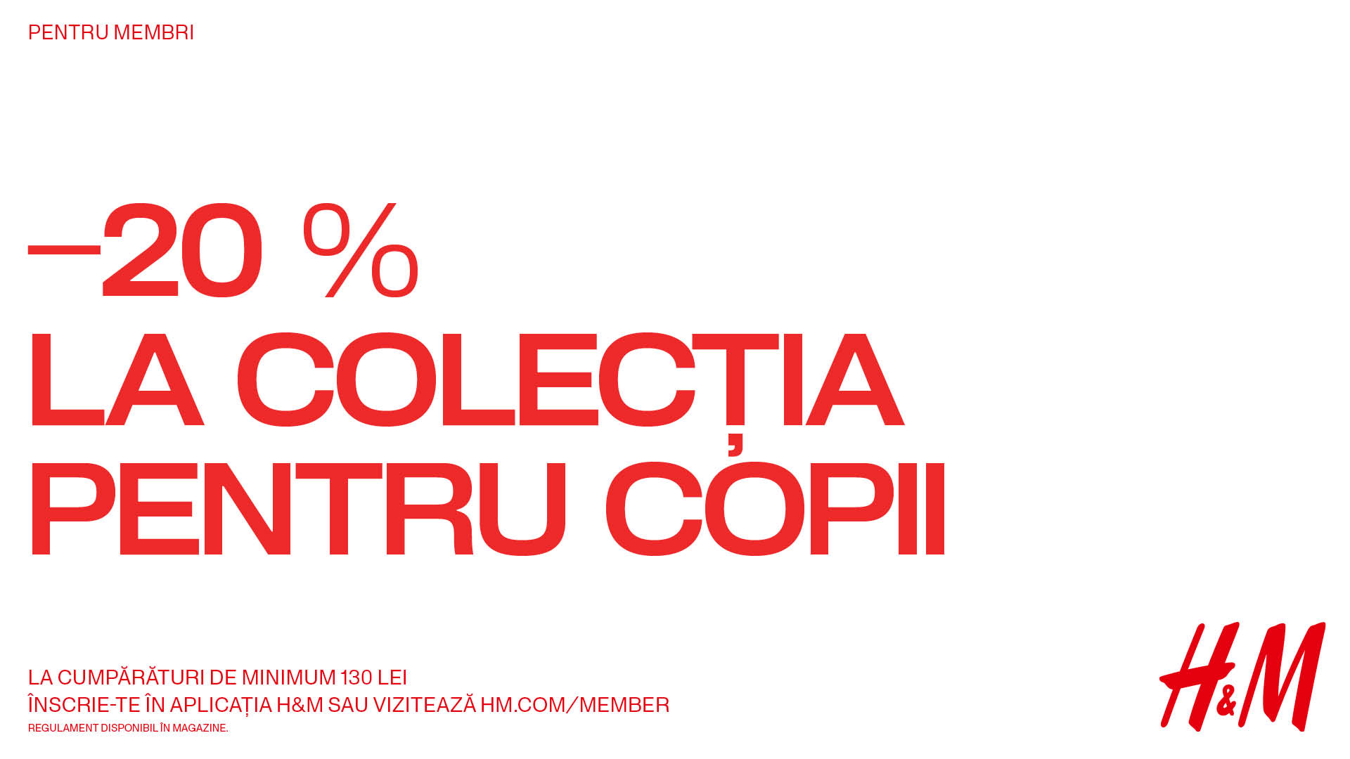 În perioada 19–21 septembrie, membrii H&M beneficiază de 20% reducere la cumpărături de minimum 130 lei din colecția Kids & Kids Home.