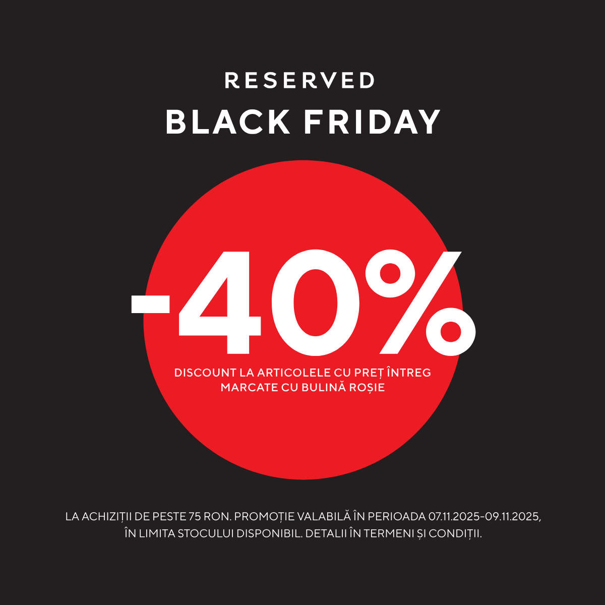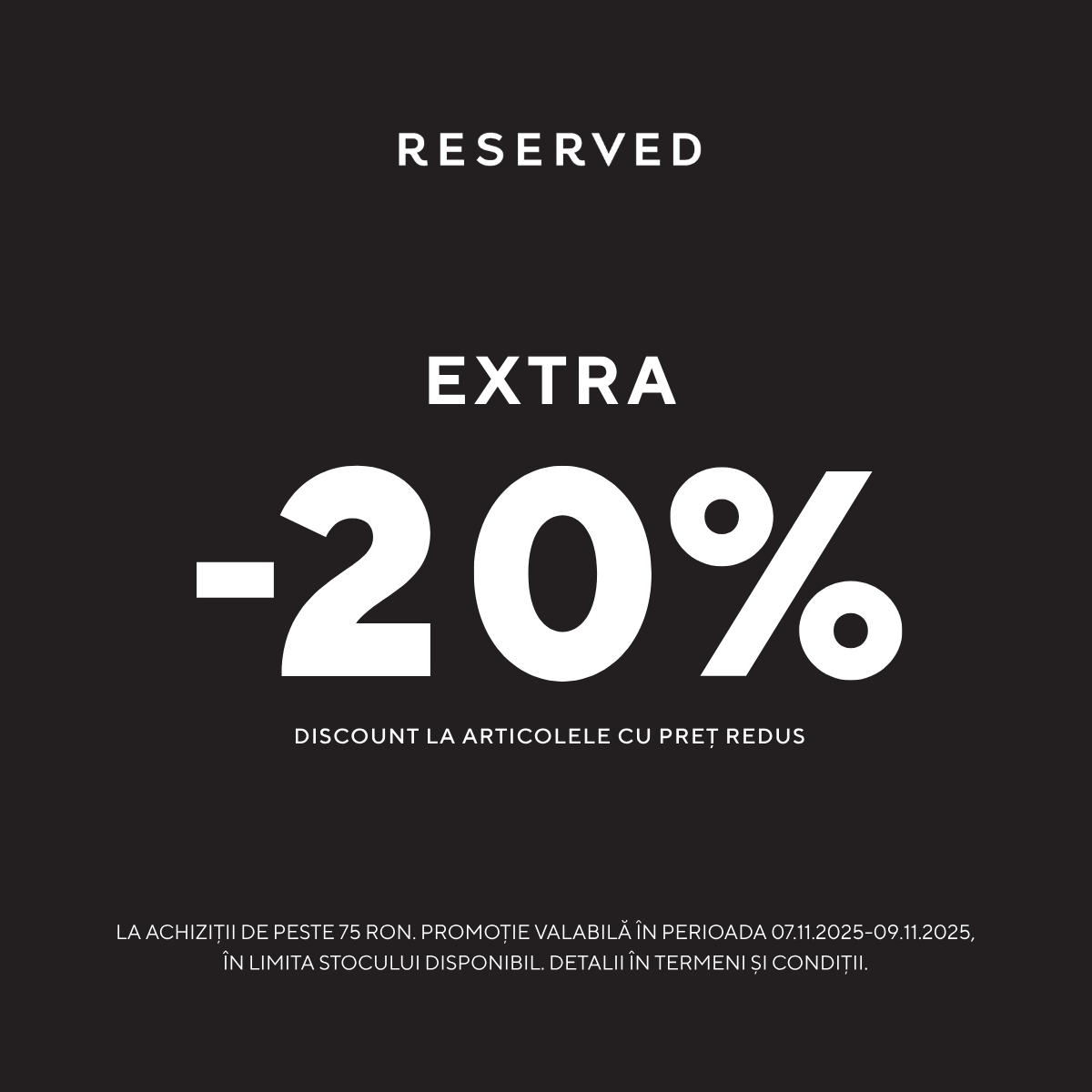 Între 7 și 9 noiembrie, bucură-te de extra -20% la articolele deja reduse și de -40% la cele cu preț întreg marcate cu bulină roșie, pentru cumpărături de minimum 75 RON.